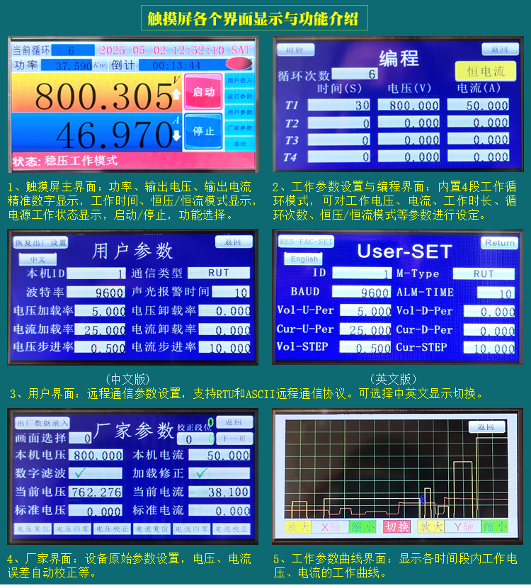 4、智能觸摸屏顯示與控制界面,界面直觀操作簡單。電壓電流和功率3位小數(shù)點精準(zhǔn)數(shù)字顯示。可編程,可進(jìn)行多種功能和參數(shù)設(shè)置。電源內(nèi)置四段計時,一次可執(zhí)行最多四組不同電壓電流、延遲時間運(yùn)行時間的設(shè)定,并可連續(xù)循環(huán)99999次。