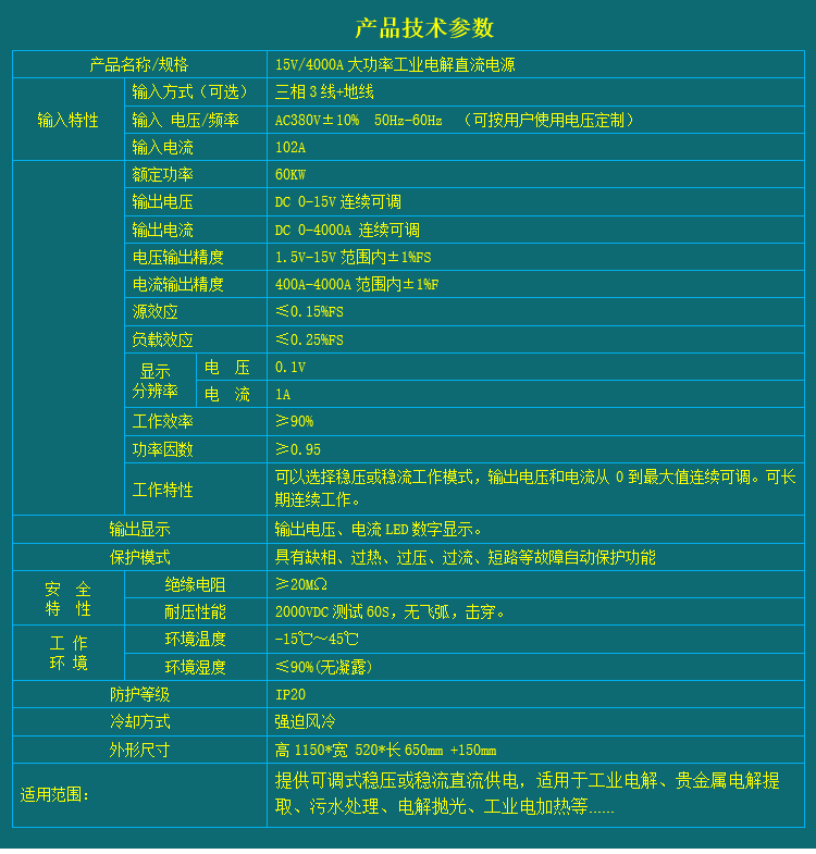 提供可調(diào)式穩(wěn)壓或穩(wěn)流直流供電,適用于工業(yè)電解、貴金屬電解提取、污水處理、電解拋光、工業(yè)電加熱等.....